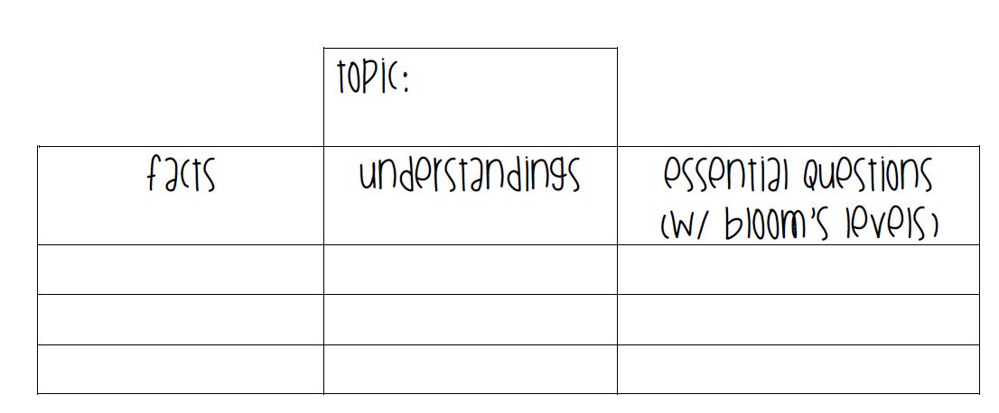 Here I am using the framework by Wiggins and McTighe (2005). Facts are usually expressed in nouns, the basic components, pieces of knowledge related to a topic. Essential Questions consist of a variety of types of questions targeting various levels of thinking. This is where we draw a connection to thinking through Bloom’s taxonomy. Understandings illustrate what the intact big understandings embedded in a topic might be. To keep these understandings big, they are expressed through a statement, “Students will understand that…” followed by a clause.