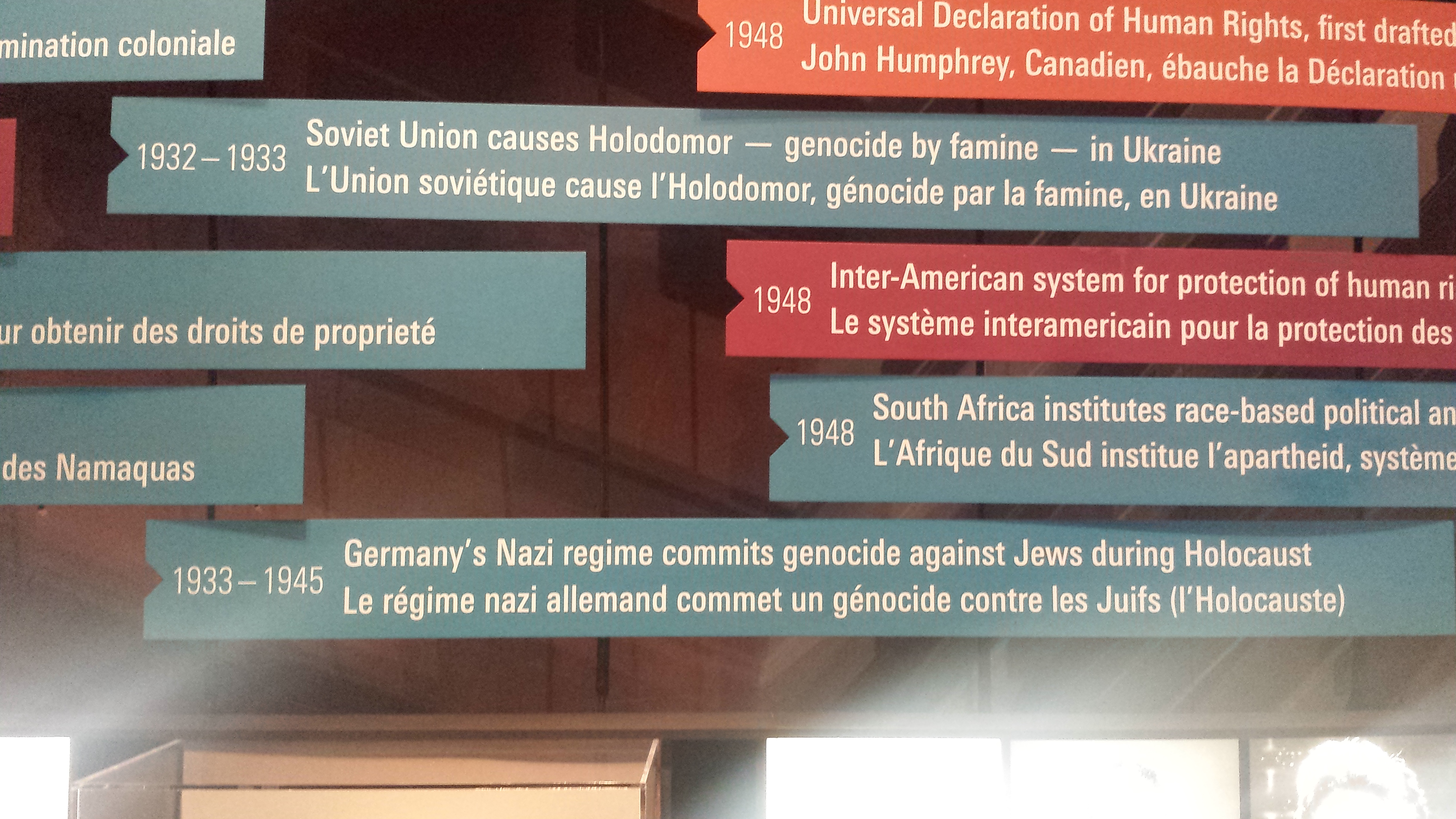 This was the first museum outside of Ukraine that dedicated so much attention and recognition to the suffering of Ukrainian people. I recently learned in the book about the museum “Miracle at the Forks” that the Ukrainian Canadian Civil Liberties Association (UCCLA) insisted that the “museum should not “elevate” one group’s suffering above others’” (p. 43) in response to the concern that this museum was going to be “another Holocaust museum”. The Ukrainian Canadian Congress carried forward what UCCLA had started by opposing the main presence of the Holocaust and insisted that Holodomor as well as the internment of Ukrainians in Canada during the First World War “would be presented…. “very clearly, distinctly and permanently.” (In Ukrainian, Holodomor literally means “death by famine”). It was an artificially engineered famine in which 6 to 8 million people starved to death in one year: 1932-33. But the purpose of doing so was to wipe out the Ukrainian people, which is, by definition, an ethnic cleansing, a genocide. For more on this genocide, and how the truth was suppressed by the New York Times, here is a very brief video .
