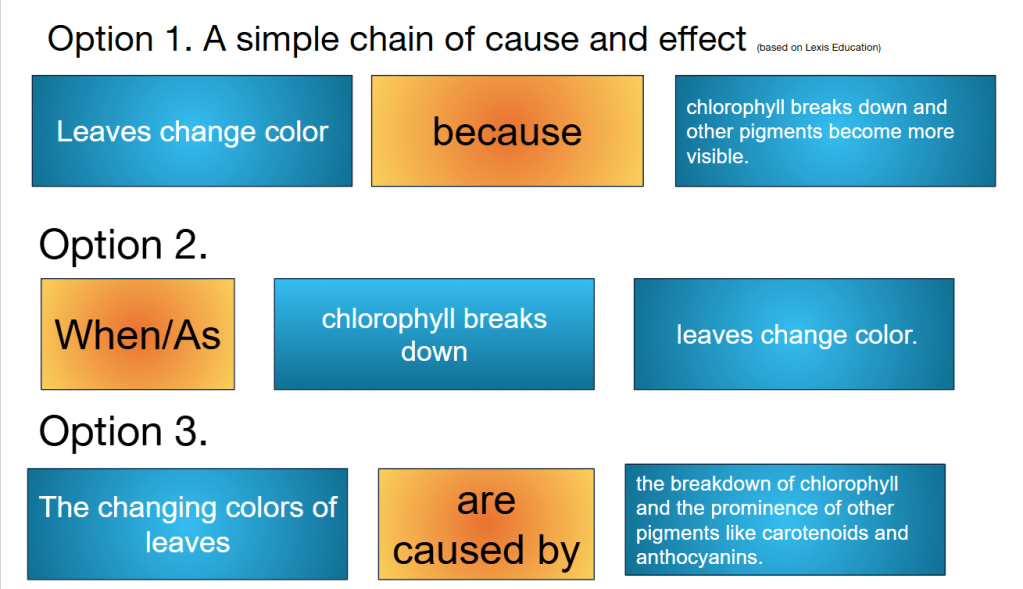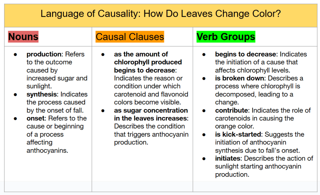 However, for students to understand this text, it is not enough to teach vocabulary. For students to understand the process behind the change in leaf color, we need to learn the language of that process, often expressed through a genre called a causal explanation and the associated language features that express causality (both causes and effects)