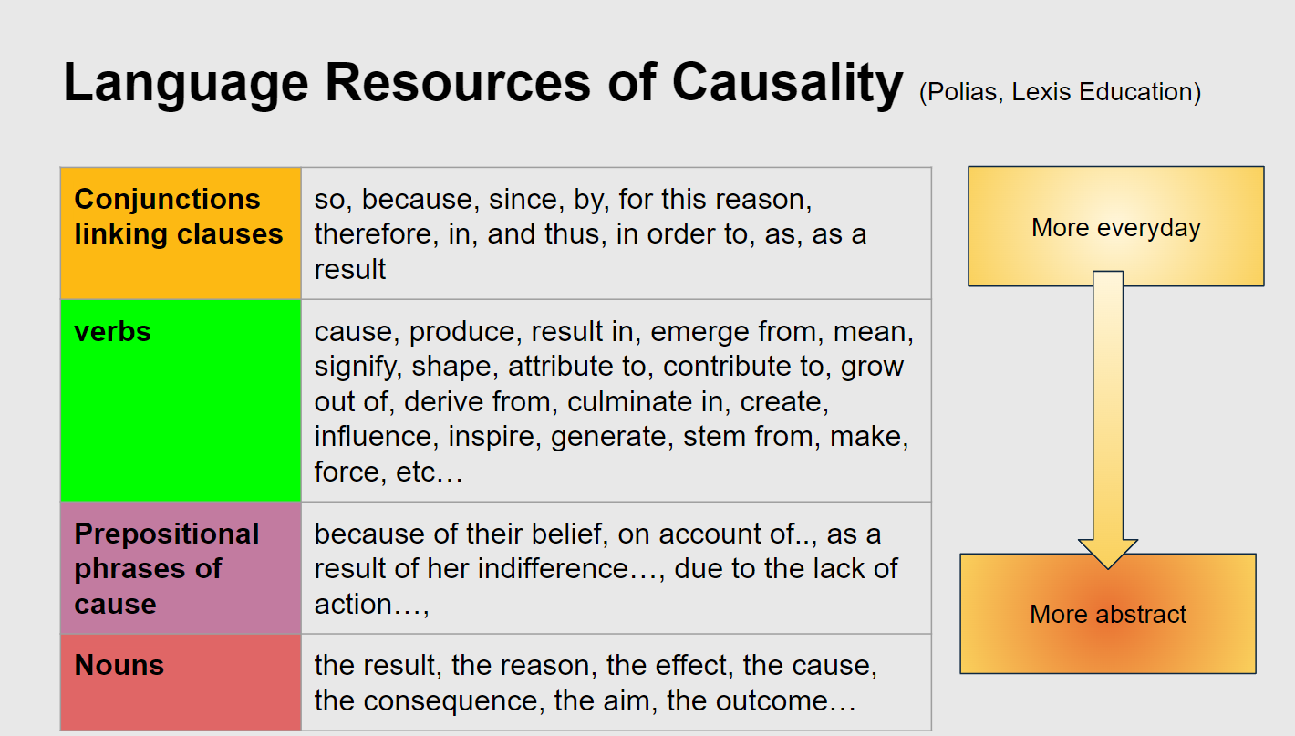 When it comes to causal language, you can also put it on a continuum from more everyday to more abstract. I want to give credit to Lexis Education where I originally saw this post by Marie Laubie on their LinkedIn page.