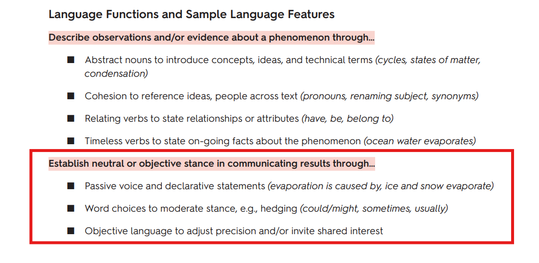 In disciplinary learning, explicitly teaching when and why to use passive voice can help multilingual learners strengthen their academic writing by aligning their language choices with the conventions of the disciplinary genres.