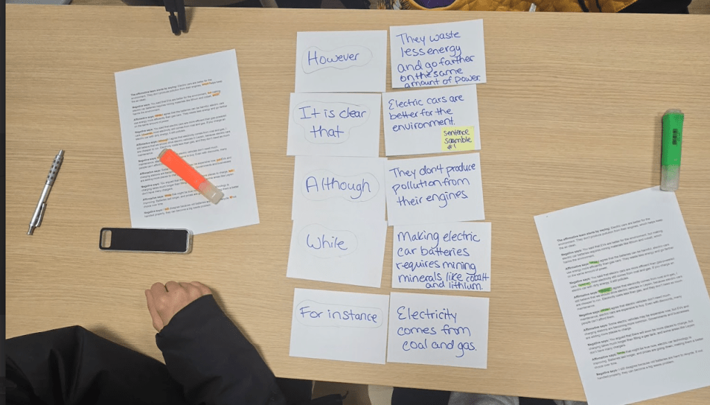 Originally, the idea for this blog came from my conversation after school with Mari when we were planning our first lesson together. During that conversation, we realized the problems with sentence frames which are provided for students to complete. The problem with giving students sentence frames was because students would NOT have to think about the functions of the text connectives and what they do for them. In other words, when we give students ready-to-use sentence frames to create concession such as while I agree, while that may be true, despite … (concerns with the lack of charging stations)… students don’t actually have to reason their way through which concessive connective they need because the task is only to comple the sentence. I continue to raise concerns with sentence frames as “static supports” that do not lead to student autonomy.