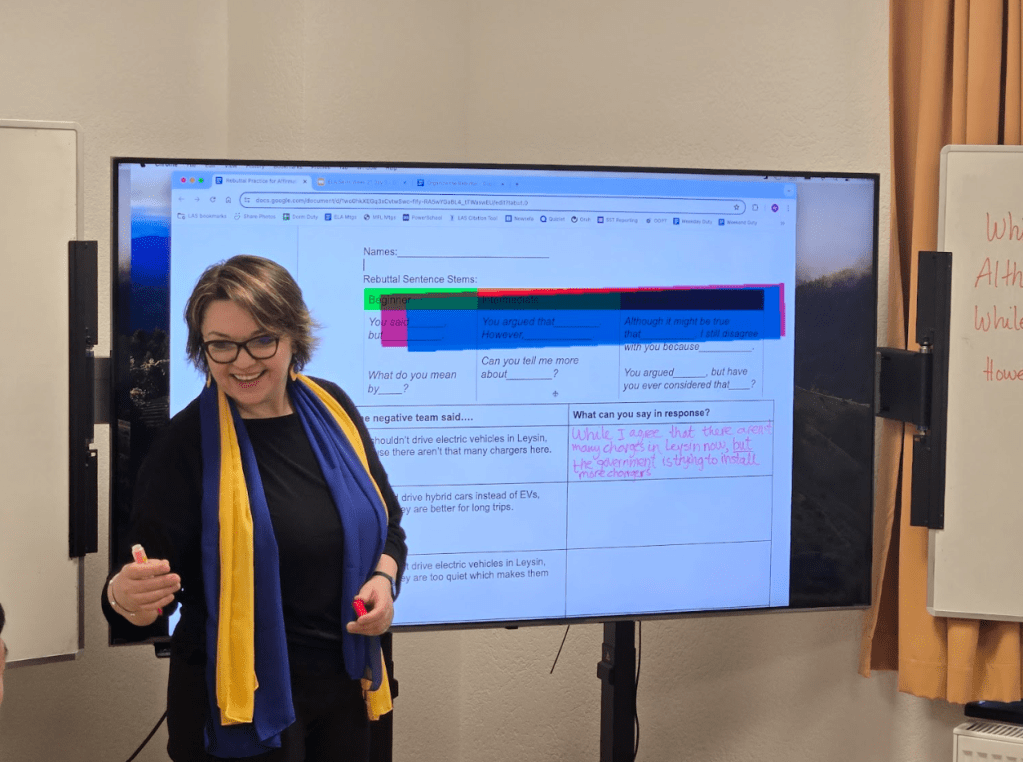 Takeaway 2 from Mari: Ruslana explained the abstract concept of concession in a concrete way by opening the door to the classroom and closing it again. “Concession,” she said, “is like opening the door to say that you heard another person’s argument, and then you close the door again with your own argument.” This explanation allowed the students to understand the function of phrases like “While I agree that___” and “Although it might be true that___.” Rather than just giving the students chunks of language and telling them to use those phrases in their rebuttal, Ruslana got the students thinking about the purpose behind that language. This is the true magic of systemic functional linguistics. Understanding what language is doing is key to allowing students to use it!