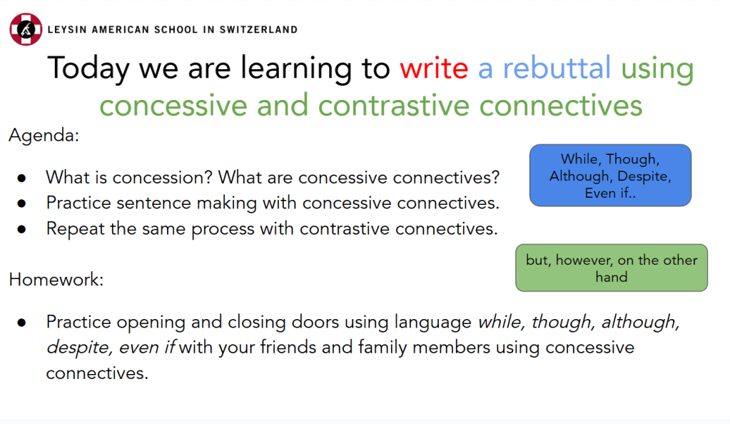 • construct a rebuttal using concessive connectives while, despite, even, if, although… and contrastive connectives however, but