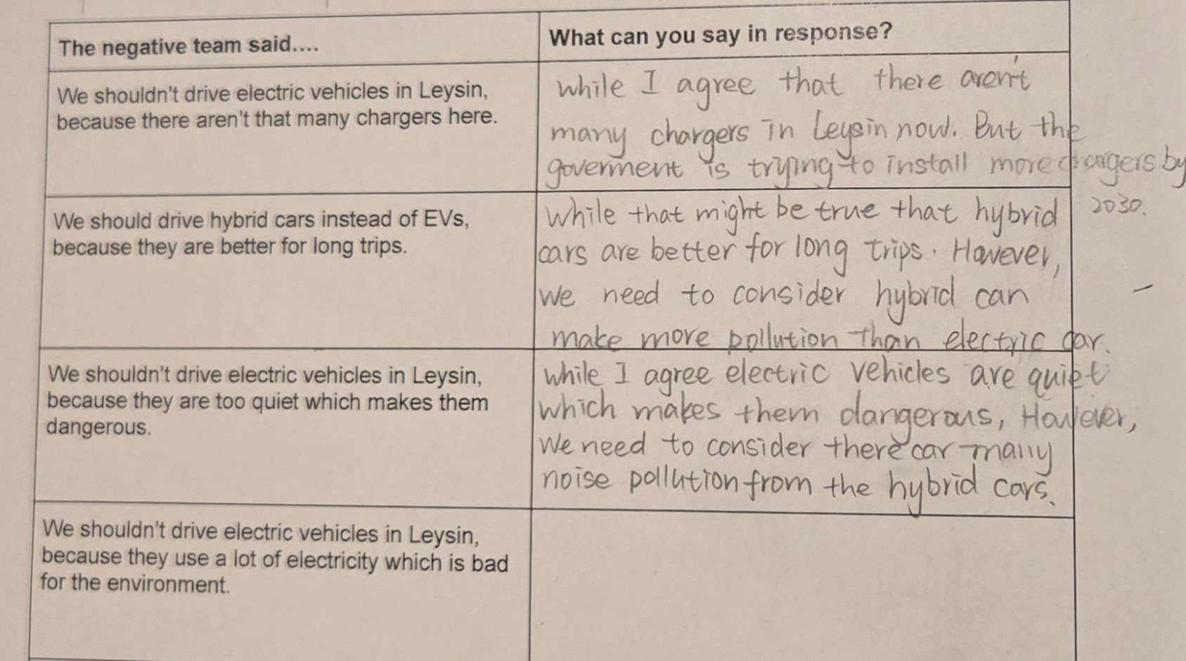 • construct an argument with relevant evidence on the topic of the use of electric vehicles in the town of Leysin.