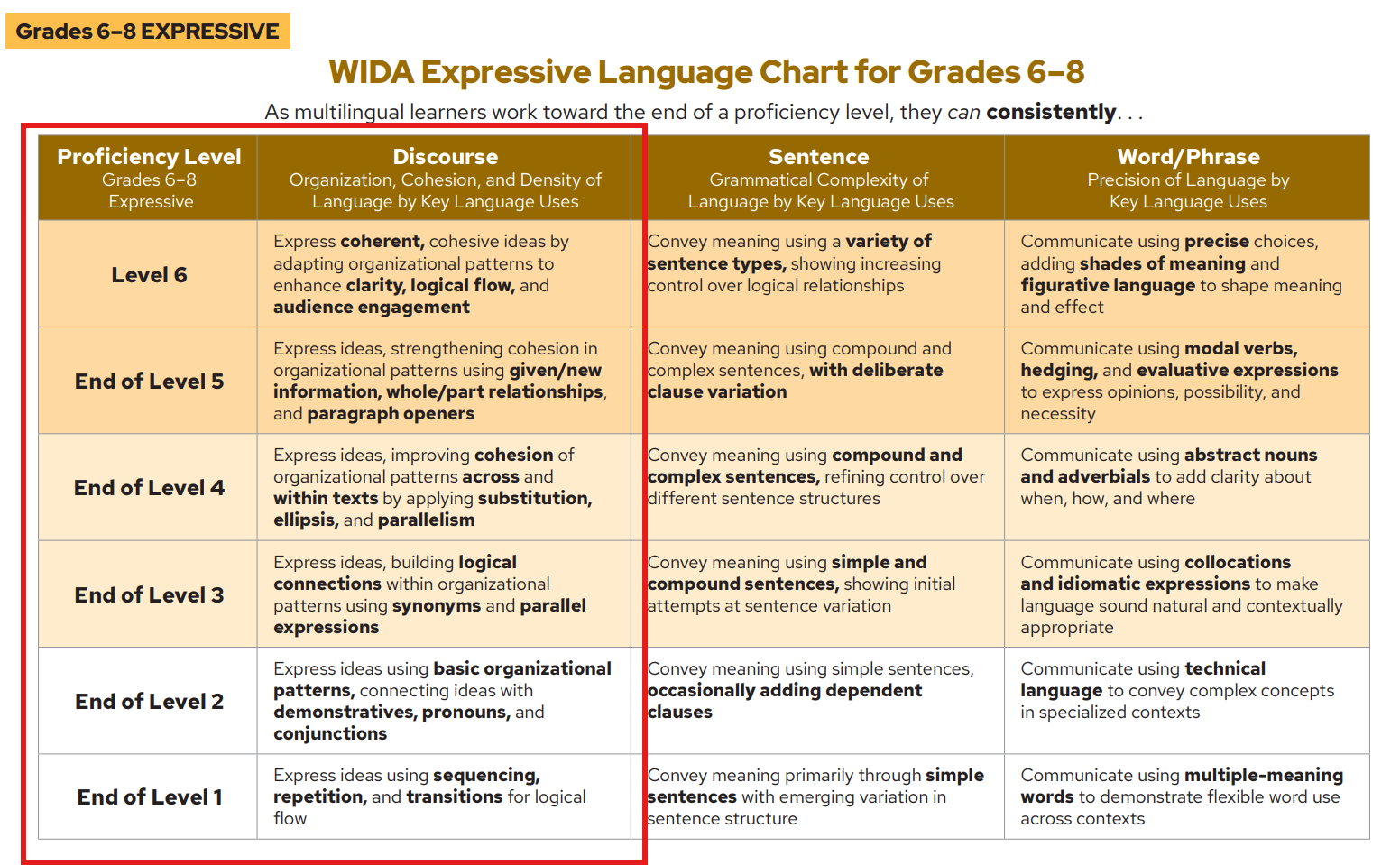 That’s why in the chart below, we are focusing only on the Discourse column from the WIDA Expressive Language Descriptors. By mapping each proficiency level to instructional strategies, we highlight what teachers can do to move students from sequencing ideas (Level 1–2), to building logical connections (Levels 3–4), to crafting cohesive, audience-engaging arguments (Levels 5–6).